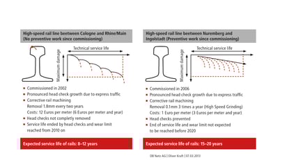 A material removal of 0.1 mm is sufficient to prevent the formation of surface cracks, which could otherwise spread deeper into the metal and lead to rail fractures. A rail surface that is continuously maintained in optimal condition reduces wear on the superstructure and rolling stock. This extends the service life of the rail in the track and significantly reduces life cycle costs along with rail noise emissions. According to a study by the Technical University of Berlin, regular preventive grinding of rail surfaces using Vossloh’s High Speed Grinding (HSG) technology can reduce lifecycle costs on heavily used urban and long-distance rail lines by 50 to 61 % compared to conventional methods. This significant reduction is due to the extension of the service life of the rails through preventive HSG treatment.