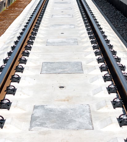 To reduce the amount of work required on the construction site and at the same time ensure greater safety on the tracks with fewer personnel, all Vossloh fastening systems for ballasted superstructures can be preassembled at the sleeper plant, for example. Vossloh has developed a precast base system for the elevated slab track in collaboration with several partners. These prefabricated concrete modules with fastening systems (without base plates) enable better load distribution than individual blocks and are used in this combination as easy-to-install and cost-effective track systems on viaducts and bridges. The system can include derailment protection and serve as a noise barrier. The fastening system can also be pre-assembled on the base.