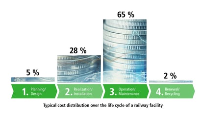 The life cycle spans several decades, from planning and installation to operational use and renewal. It is therefore advisable to take the costs of all life cycle phases into account as early as the design and planning phase. Ultimately, over 95% of follow-up costs are determined at the point of investment – 65% of which arise during the operational phase. This also highlights the key role that an intelligent maintenance strategy plays in asset management. With their disruptive power, digitalization and artificial intelligence are seen as beacons of hope for mastering the ever-increasing demands on the reliability of railway infrastructure and for being able to assess and plan future maintenance requirements more accurately.
