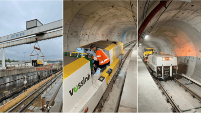 Behutsames Eingleisen per Kran, bevor es mit Tempo durch die Röhren geht.