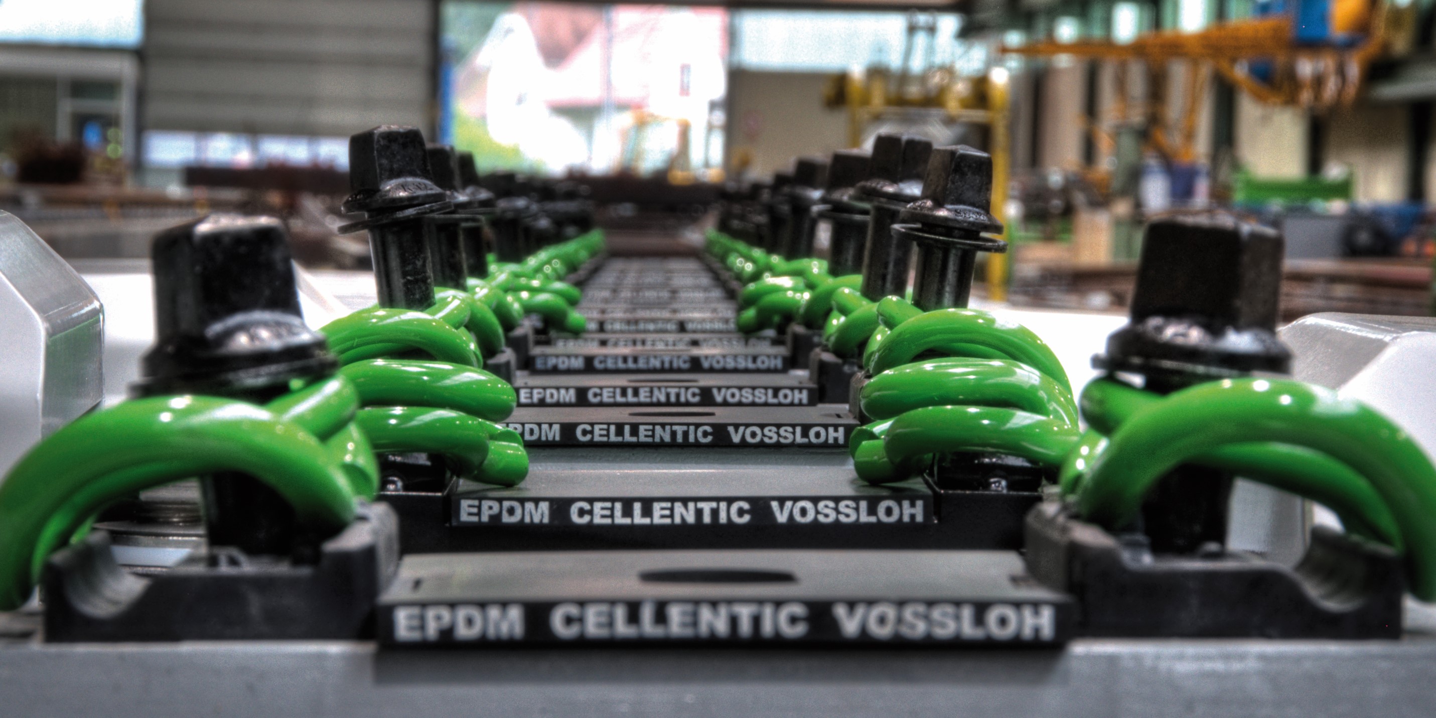 Die Minimierung von Vibrationen und Körperschall ist nicht nur für den Nahverkehr wichtig. Die Schienenbefestigungssysteme von Vossloh mit den hochelastischen Zwischenlagen aus cellentic kommen auch im konventionellen Fern- und Hochgeschwindigkeitsverkehr zum Einsatz. Denn zu hohe Lasten auf den Schotterunterbau aufgrund zu geringer Lastverteilung über die Zwischenlage, bewirken dessen Überlastung.