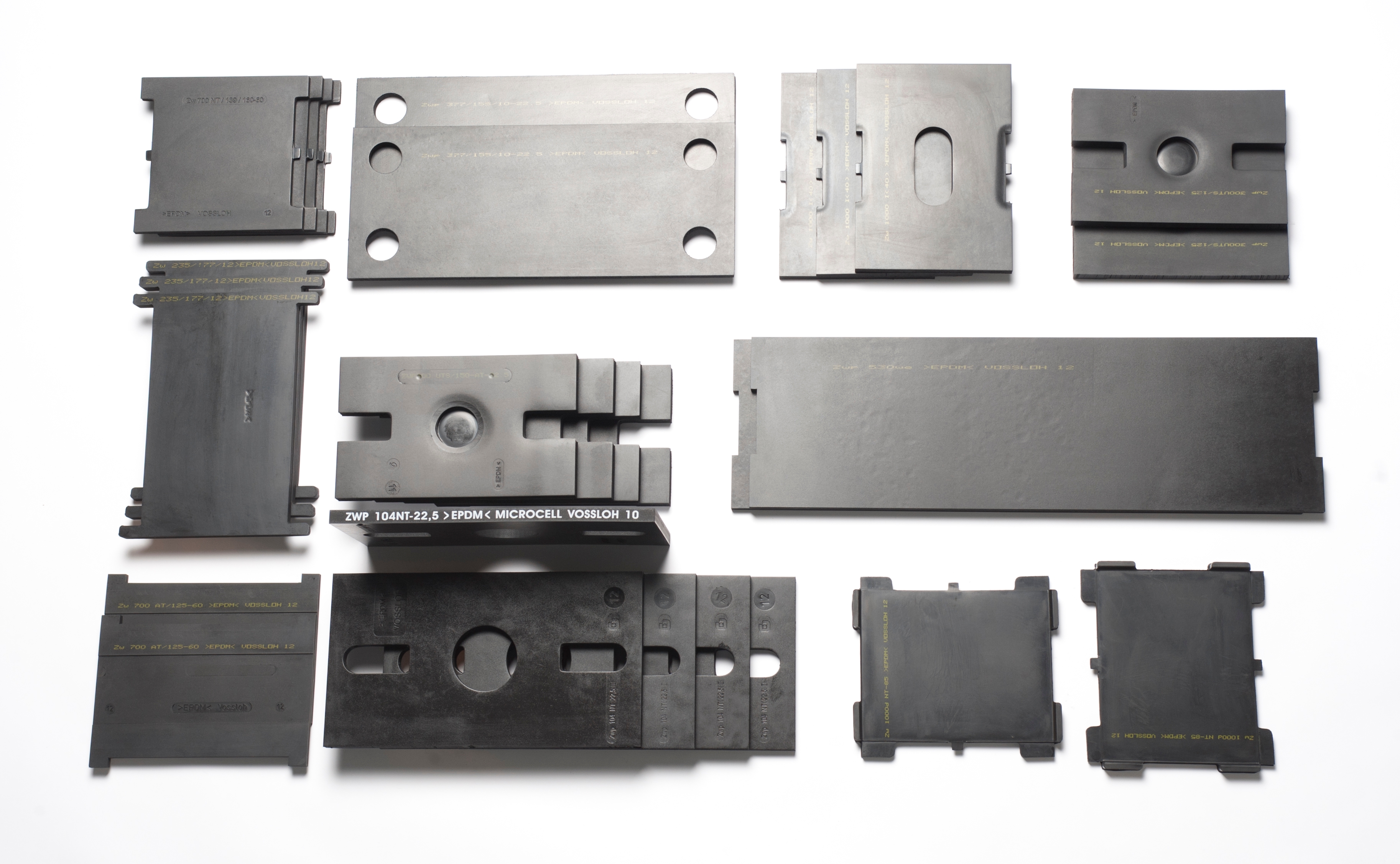 Das umfassende Produktportfolio deckt alle Anwendungsbereiche ab. Die Elastomere lassen sich in Serie oder als individualisierte Einzellösung realisieren. Neben projektspezifischen Größen, werden die Zuschnitte z.B. exakt auf die Weichengeometrie abgestimmt.