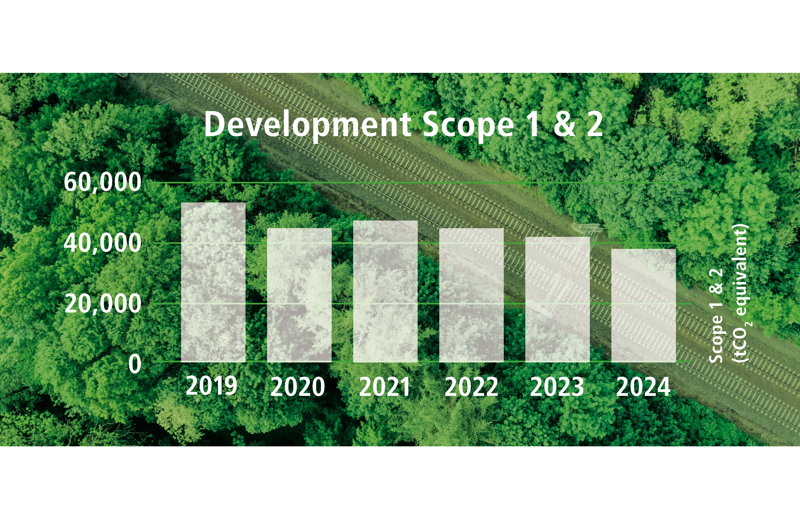 Vossloh aims to achieve carbon neutrality in its own business operations (Scope 1 and 2) by 2030. This goal was incorporated into Vossloh's sustainability strategy at an early stage in order to mitigate and adapt to physical and transitory risks associated with climate change. This target also enabled Vossloh to keep pace with developments among customers, markets, and environmental requirements. The necessary reduction in CO2e intensity of 11 percent per year is backed by concrete measures and CO2e budgets. Remaining – locked-in – emissions must then be compensated. Vossloh is also currently working on solutions to reduce indirect (Scope 3) emissions measured for the first time in 2024, which are largely beyond its direct control.