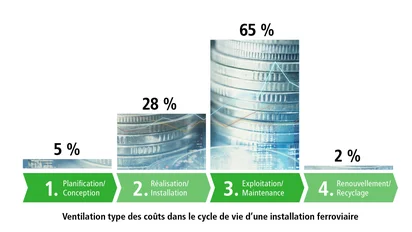 Le cycle de vie s’étend de la planification à l’installation, en passant par l’exploitation et la rénovation, sur plusieurs décennies. Il est donc recommandé de prendre en compte le coût de toutes les phases du cycle de vie dès la phase de conception et de planification. En effet, la décision d’investissement détermine plus de 95 % des coûts induits, dont 65 % sont générés pendant la phase d’exploitation. Cela montre également qu’une stratégie de maintenance intelligente joue un rôle clé dans la gestion des installations. Avec leur potentiel disruptif, la numérisation et l’intelligence artificielle sont considérées comme porteuses d’espoir pour répondre aux exigences toujours croissantes en matière de fiabilité de l’infrastructure ferroviaire et pour pouvoir évaluer et planifier avec plus de précision les besoins futurs en matière de maintenance.