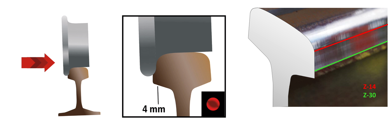 En raison des forces centrifuges lors des parcours en courbe, le profil de la roue est successivement copié négativement dans le bord de roulement du champignon à l‘intérieur de la courbe – ce qui entraîne des marques et, à un stade avancé, des usures prononcées. Dans l‘axe des Y, il faut supposer une plage critique commençant à 4 mm. Les outils de fraisage conventionnels risquent de toucher le boudin de la roue sur la face inférieure de l‘usure avancée et ne produisent donc aucun enlèvement de matière pour la correction des défauts. Après la correction, le rail peut à nouveau être usiné conformément aux règles sans aucune restriction.